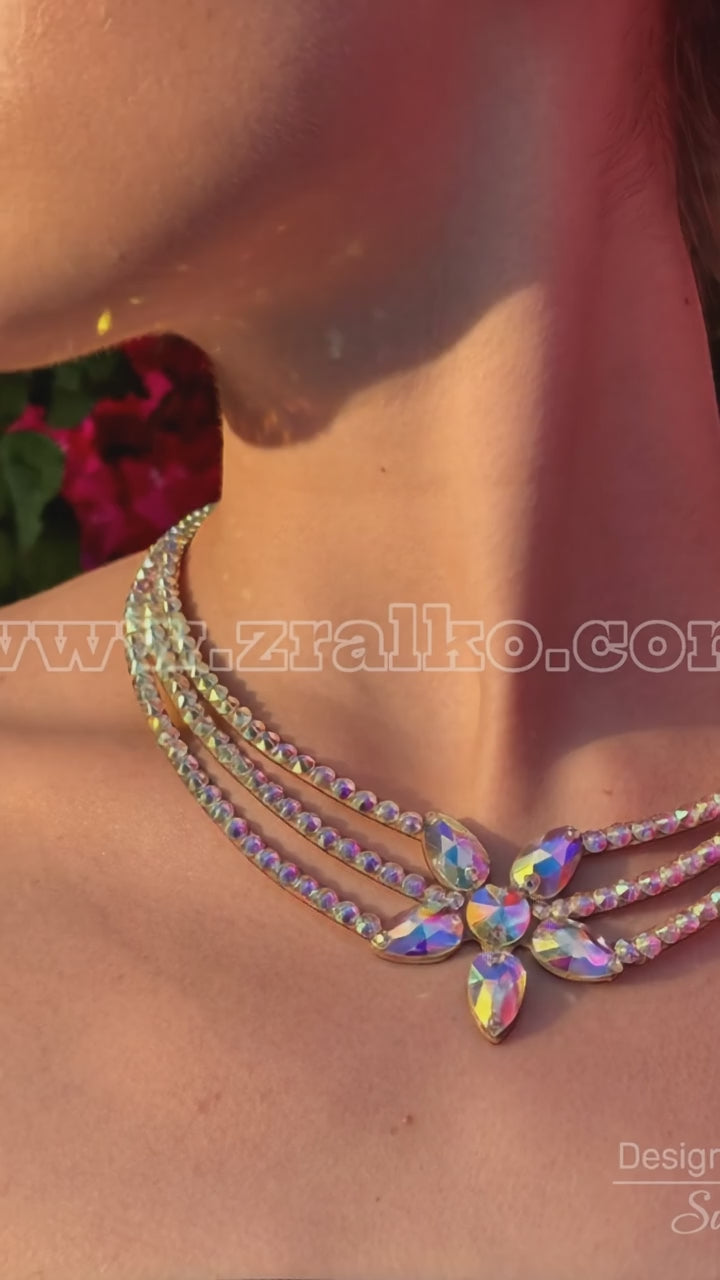 A brilliant necklace decorated with shimmering Crystal AB rhinestones that catch and reflect light beautifully. Perfect for dancers and evening looks, it adds a clean, radiant sparkle to any outfit.